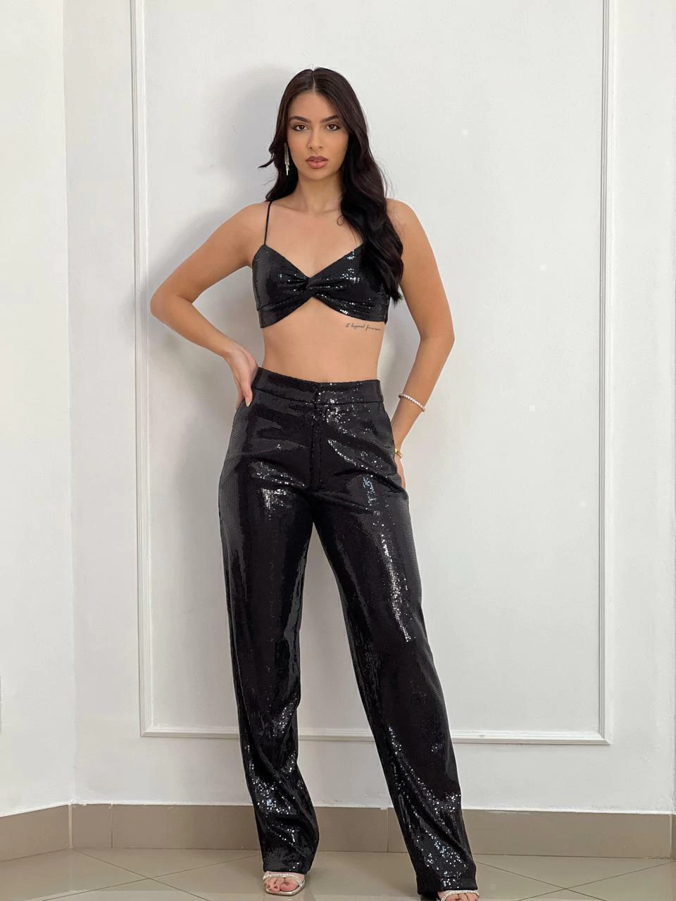 A elegância do paetê com o corte clássico da alfaiataria. A Calça Rebeca é feita em paetê preto, com cintura alta e modelagem reta mais soltinha, que alonga a silhueta e garante sofisticação com conforto. Ideal para produções noturnas com brilho na medida certa — perfeita para quem quer um look moderno, chique e nada óbvio.